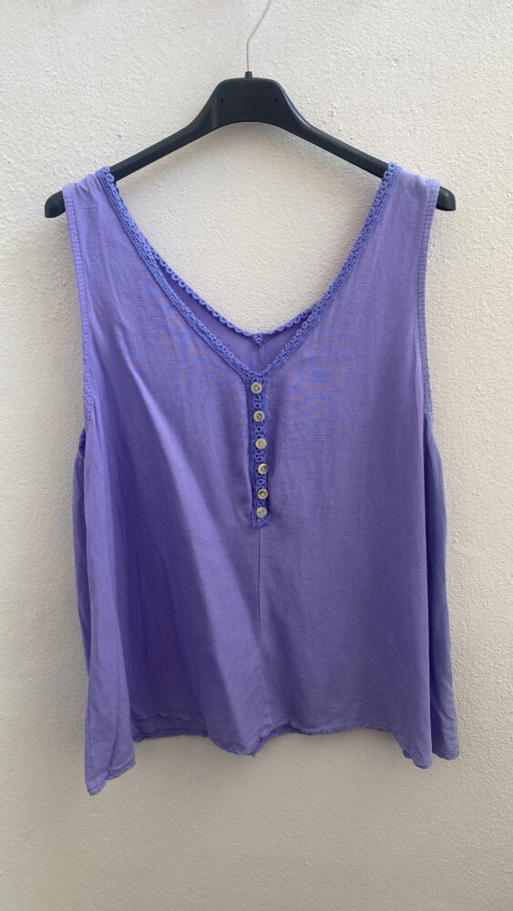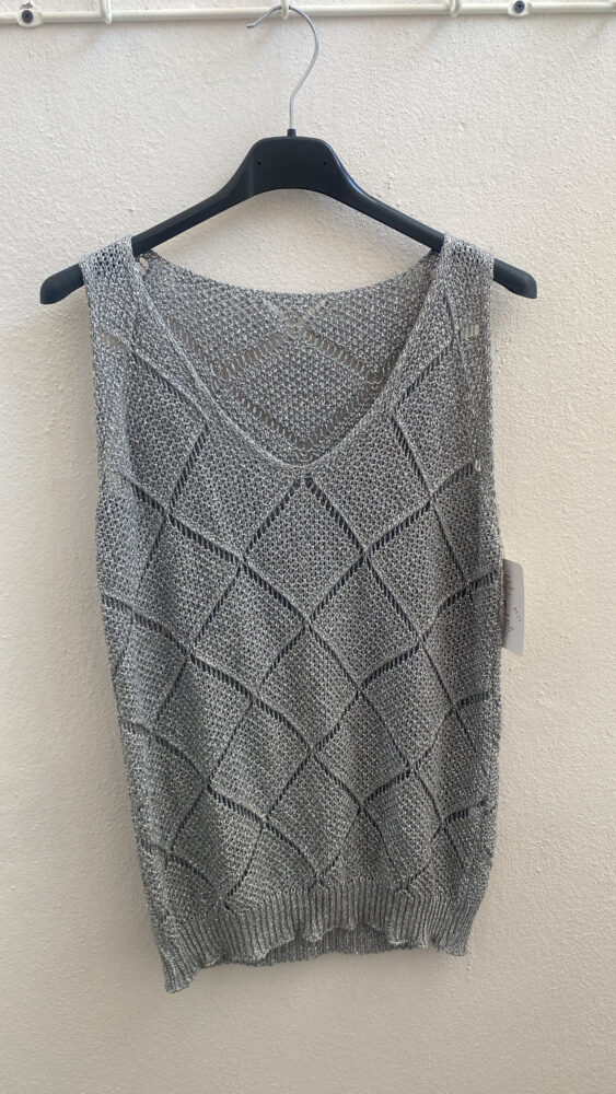 •Αμάνικη μπλούζα V με ελαστικότητα κεντημένη με ασημοκλωστή και λάστιχο στο τελείωμα στο κάτω μέρος.