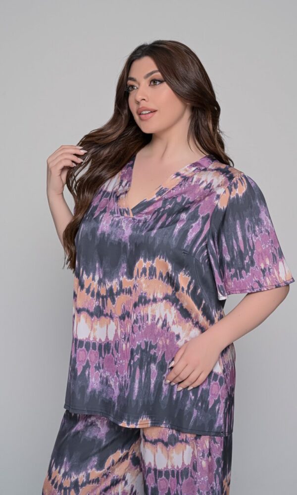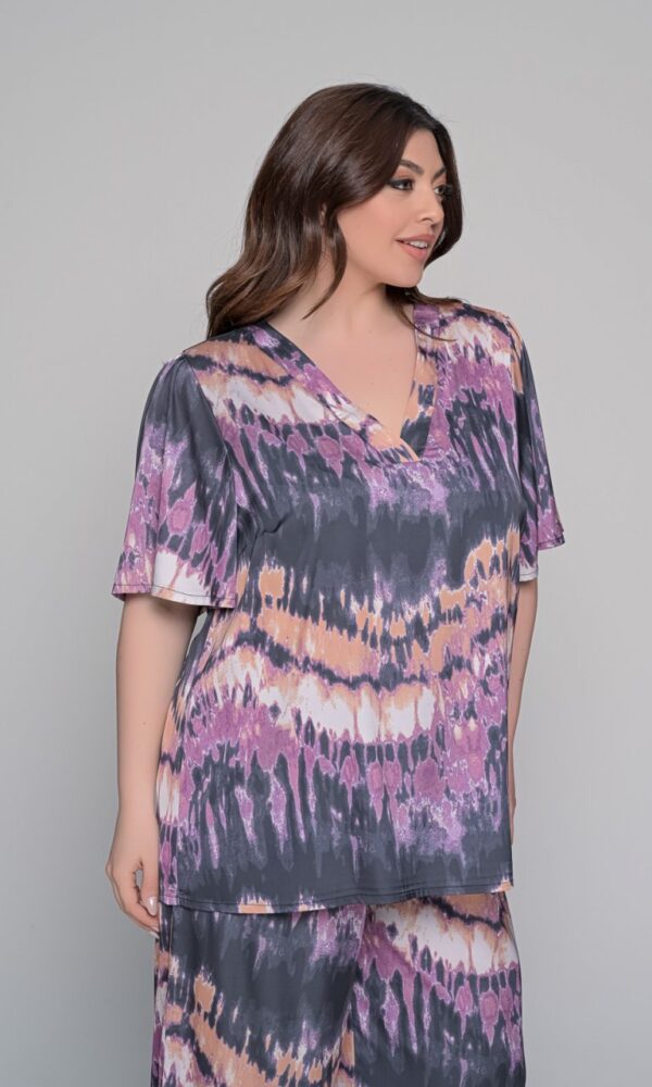 • Μπλούζα σατέν κοντομάνικη εμπριμέ με V. Άνετη και δροσερή για όλες τις ώρες