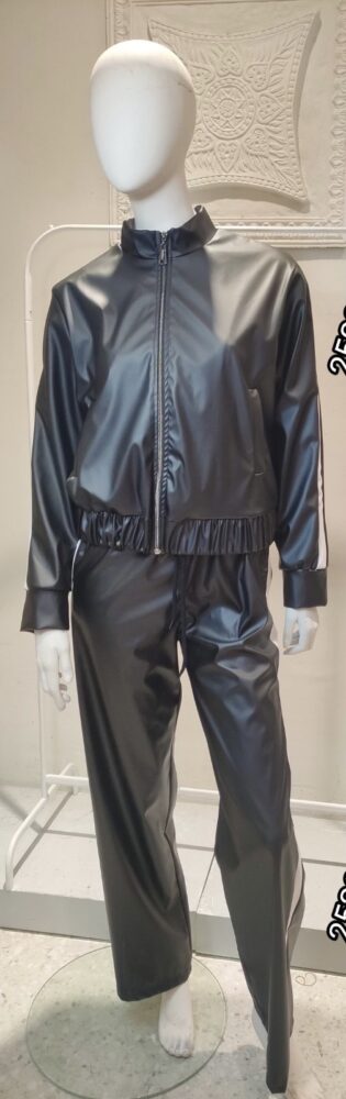 • Δερμάτινη ζακέτα με άσπρες ρίγες στα μανίκια και τσέπες