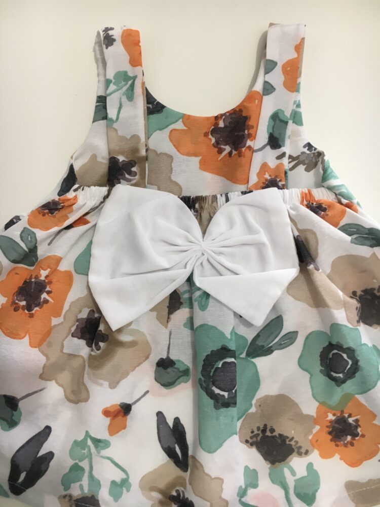 Φόρεμα λευκό, ραντάκι με πολύχρωμα λουλούδια σε ολόκληρη την επιφάνειά του και με έναν μεγάλο λευκό φιόγκο στο πίσω μέρος του. Λευκό καπέλο ψάθινο με λευκή κορδέλα και επάνω της πολύχρωμα λουλούδια.