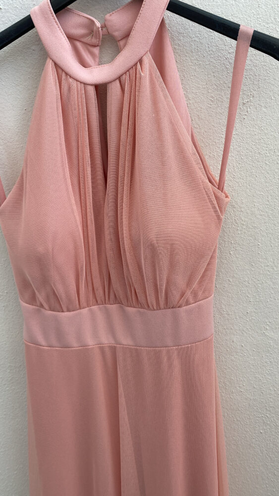 • Φόρεμα maxi αμάνικο απο τούλι με δέσιμο γύρω απο τον λαιμό,ενίσχυση στο στήθος,ενσωματωμένη ζώνη με άνοιγμα στο επάνω μπροστινό και πίσω μέρος.