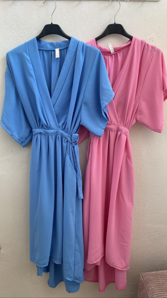•Φόρεμα μιντι που δένει στο πλαι στην μέση με ζωνάκι. Η πίσω μεριά του φορέματος είναι πιο μακριά από την μπροστινή ώστε να δίνει κίνηση και στο τελείωμα του έχει βολάν