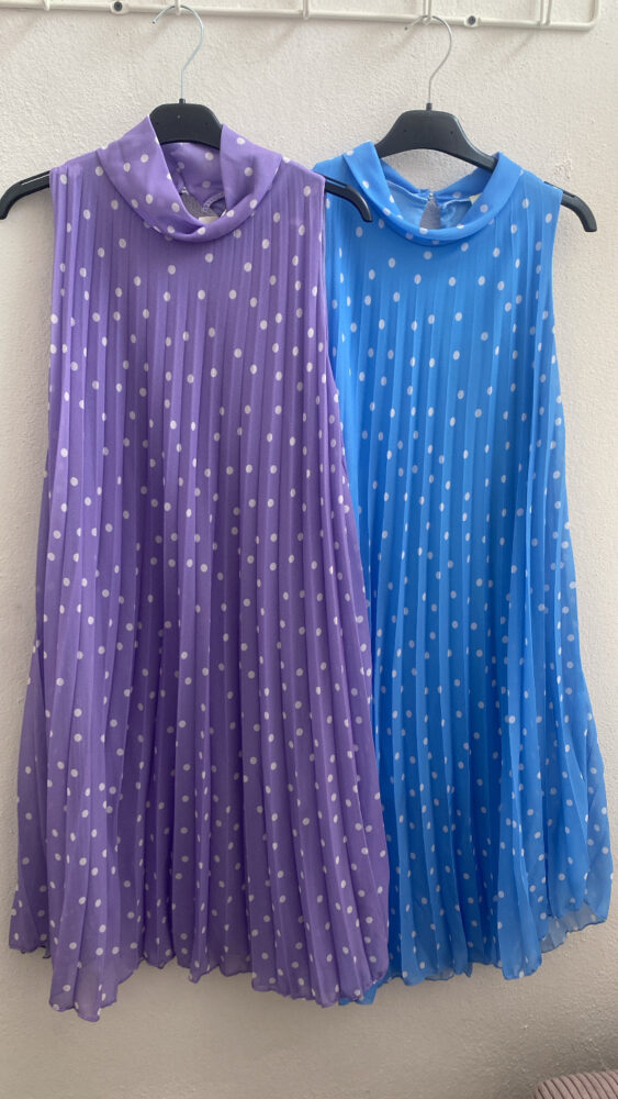 • Φόρεμα πλισέ,πουά, κοντό,αμάνικο με μικρό ζιβάγκο και κουμπί στο πίσω μέρος του λαιμού