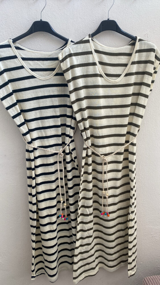 •Φόρεμα μιντι  με ρίγες καλοκαιρινό πλεκτό ,εφαρμοστό με ζωνάκι στην μέση.
