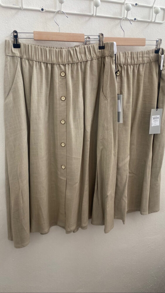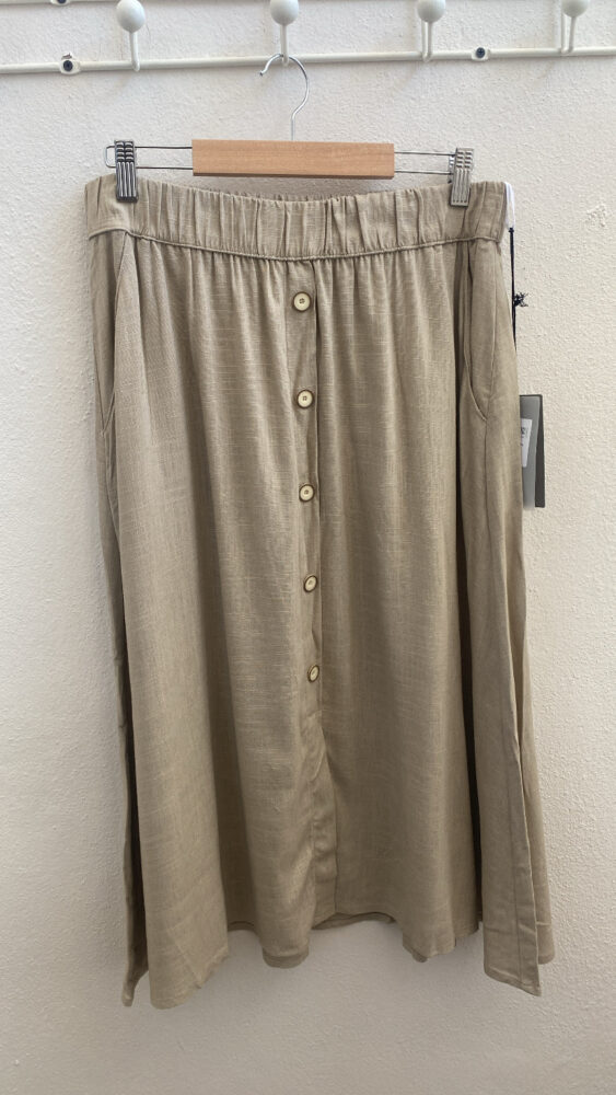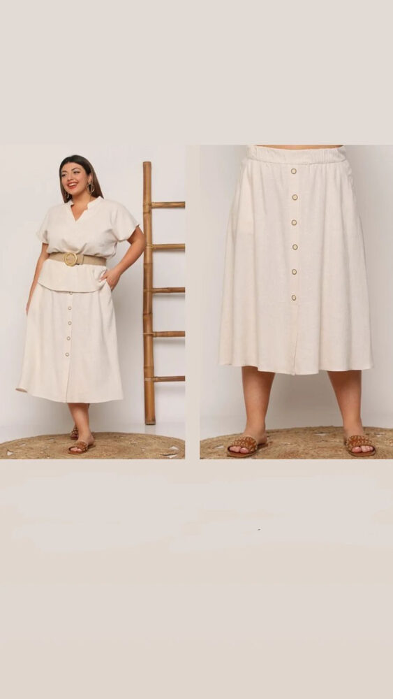 Φουύτα μιντι λινή με κουμπιά μπροστά και λάστιχο στην μέση για καλύτερη εφαρμογή. Ύφασμα: 70%VIS – 30%LINEN