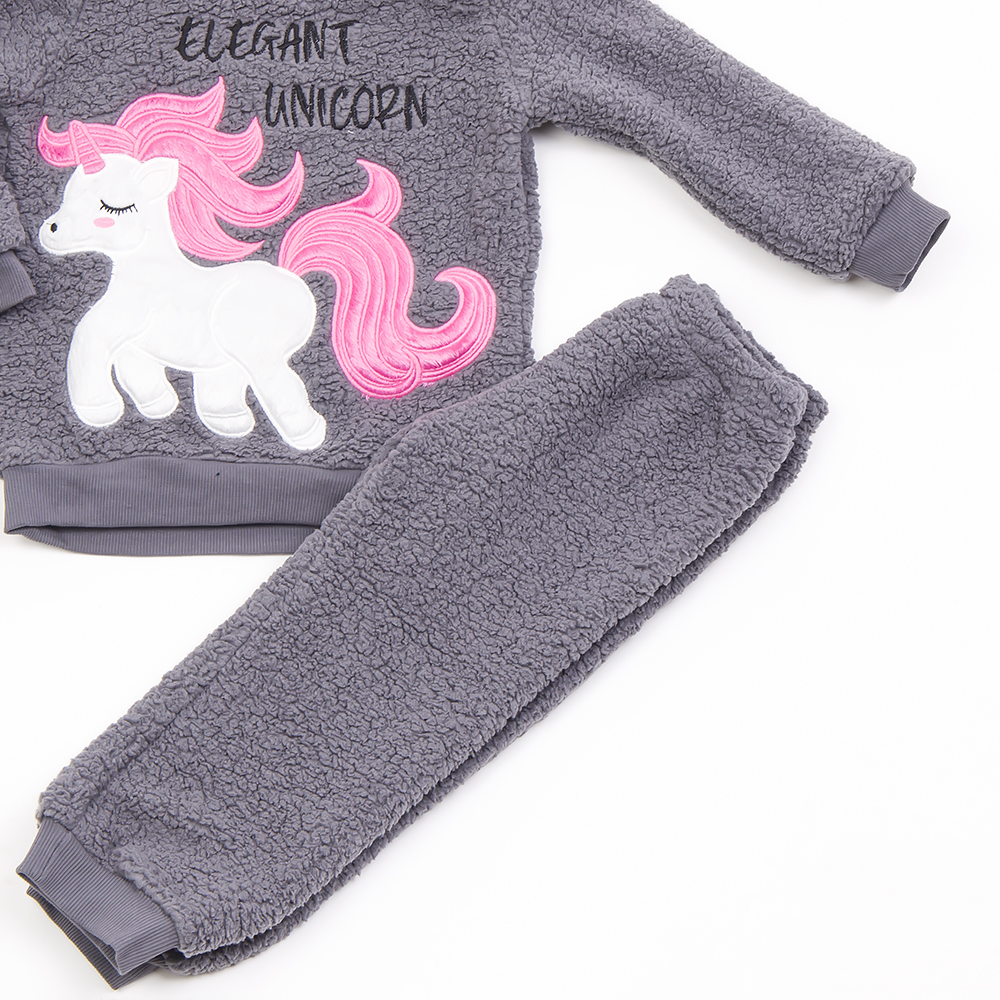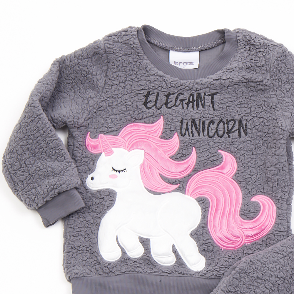 Γκρι μπλούζα, χνουδωτή με μακρύ μανίκι και σχέδιο μονόκερος. Γκρι παντελόνι, χνουδωτό, μακρύ με λάστιχο στο επάνω και κάτω μέρος του.