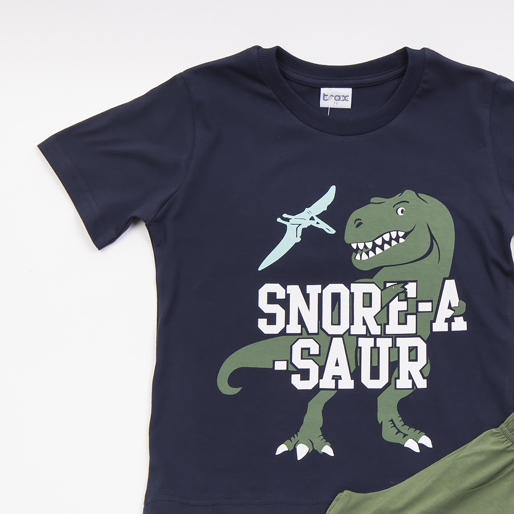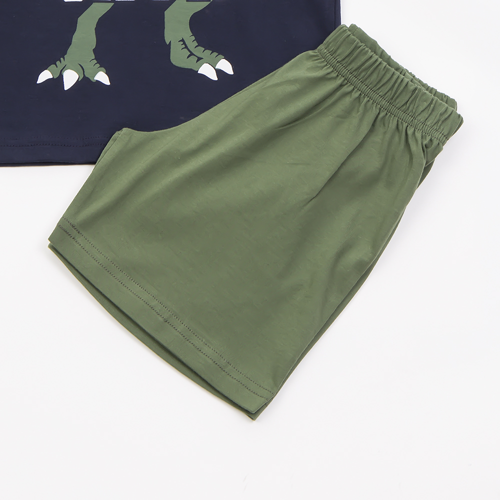 Μπλε κοντομάνικη μπλούζα με σχέδιο δεινόσαυρο. Κοντό παντελονάκι χακί με λάστιχο στην μέση .