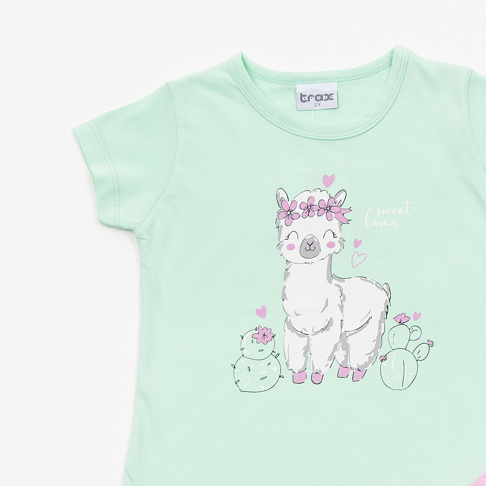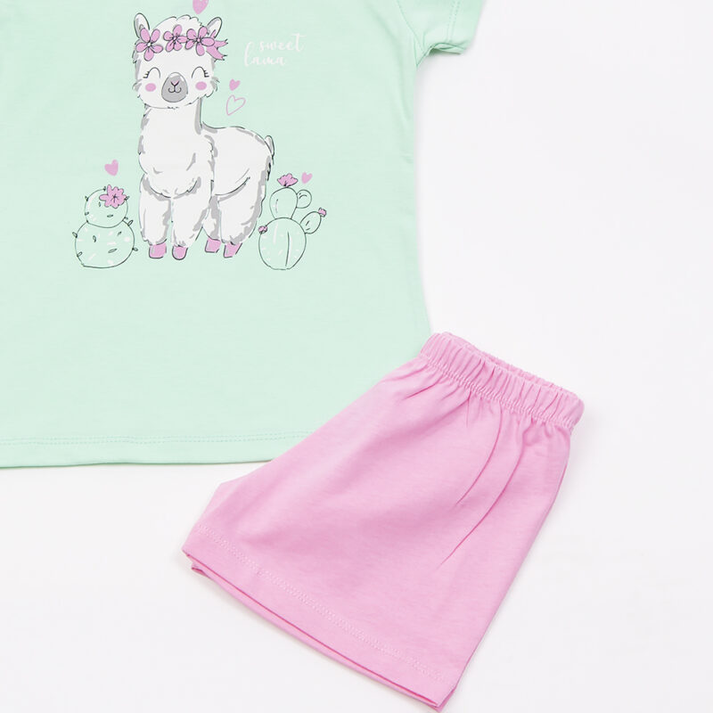 Κοντομάνικη μπλούζα βεραμάν χρώμα με σχέδιο ζωάκι λάμα . Κοντό παντελονάκι φούξια με λάστιχο στην μέση .