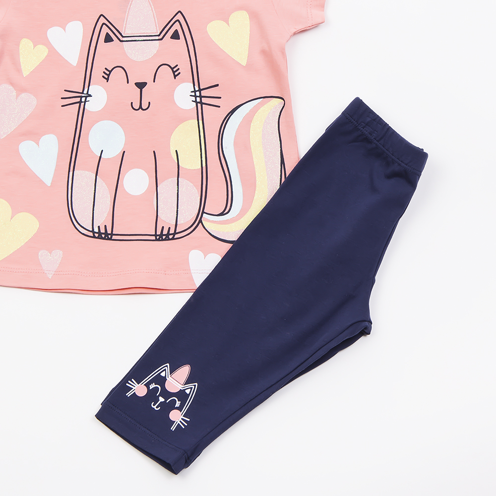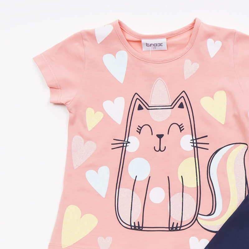 Χρώμα μπλούζας κοντομάνικη κοραλλί, με σχέδιο γατούλα .Σκούρο μπλε κοντό παντελονάκι με λάστιχο στο επάνω μέρος και γατούλα στο μπροστινό μέρος