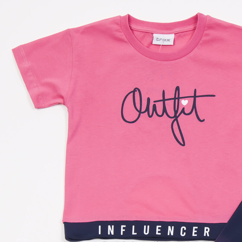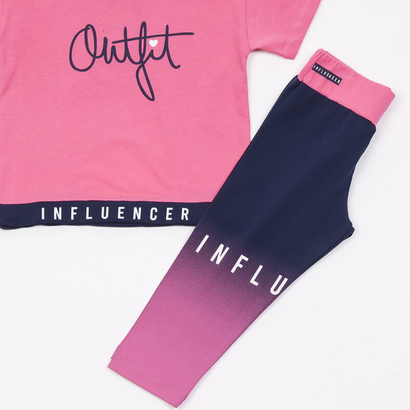 Χρώμα μπλούζας κοντομάνικη φούξια, με λάστιχο στο κάτω μέρος . Παντελόνι κολάν με διχρωμία