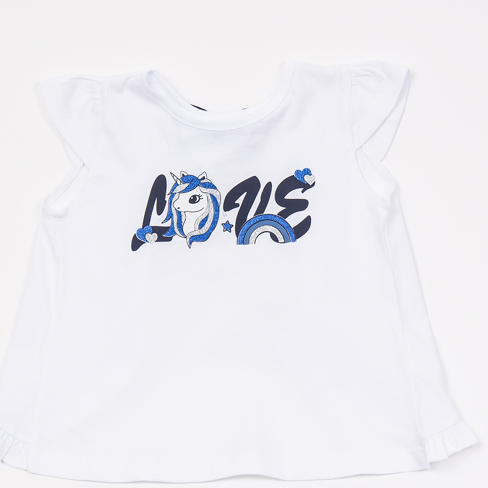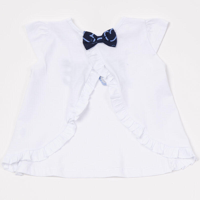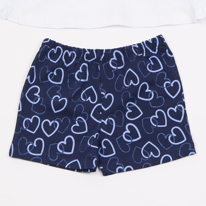 Χρώμα μπλούζας αμάνικη άσπρη με γράμματα, ανοιχτή στο πίσω μέρος και πιάνεται με ένα φιογκάκι . Κοντό παντελονάκι μπλε με καρδιές και λάστιχο στην μέση.