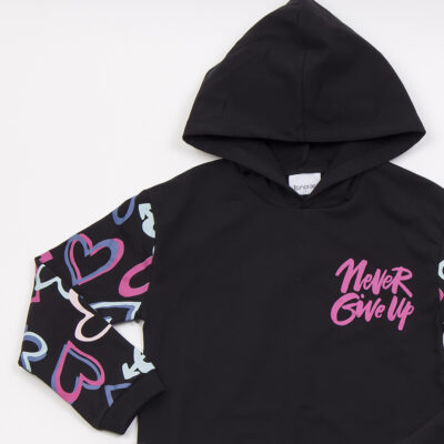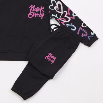 Χρώμα μαύρο ,μακρυμάνικη με γράμματα και το δεξί μανίκι με σχεδιάκια καρδούλες , παντελόνι με λάστιχο στο πάνω και κάτω μέρος.