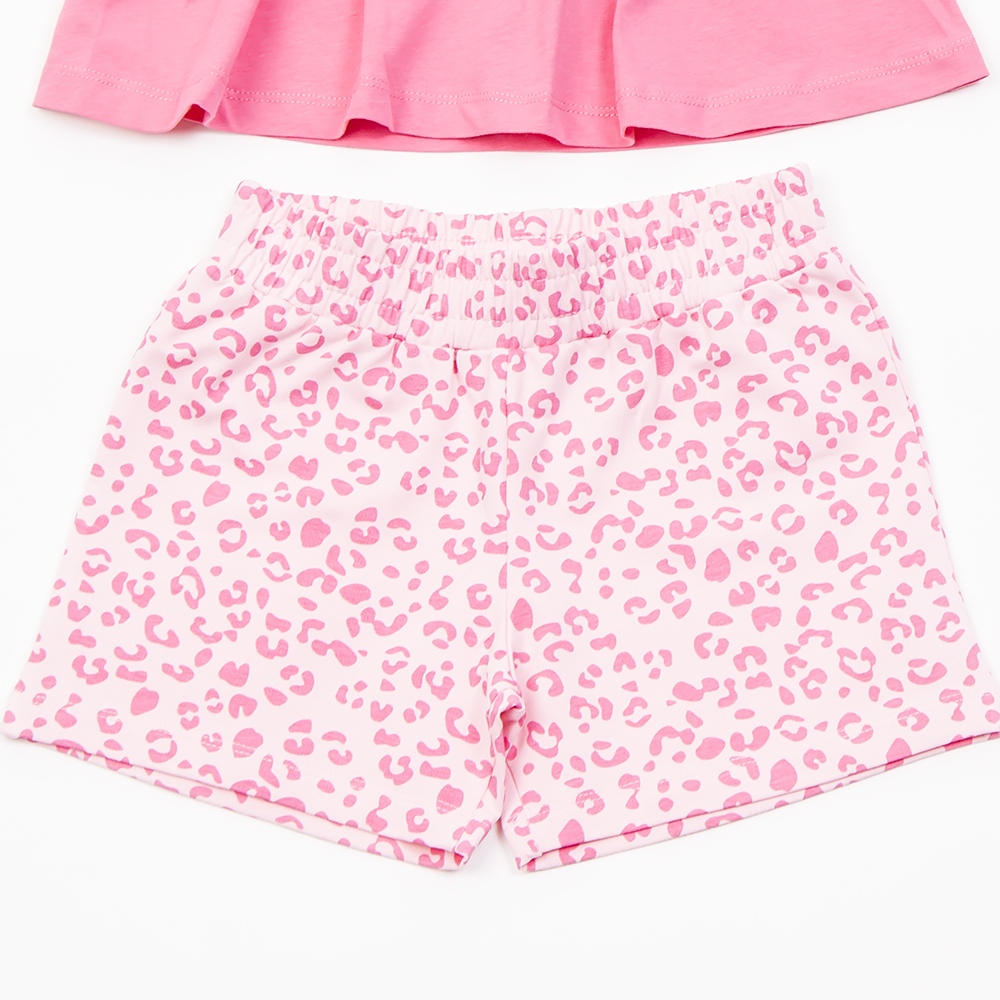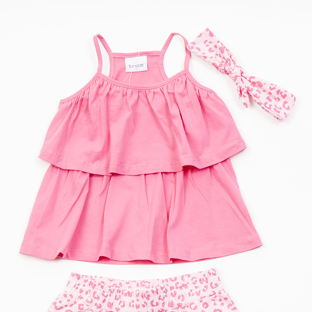 Χρώμα μπλούζας φούξια, τιραντακι με βολάν .Ροζ με φούξια λεοπαρ παντελονάκι κοντό με λάστιχο στο επάνω μέρος και ιδια κορδέλα για τα μαλλιά.
