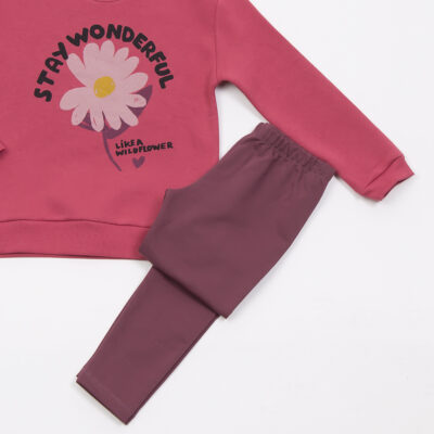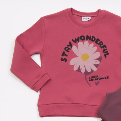Χρώμα τερακότα και μπορντό παντελόνι ,μακρυμάνικη με λουλούδι και γράμματα, παντελόνι με λάστιχο στο πάνω μέρος.