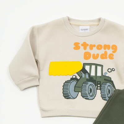 Χρώμα μπεζ και χακί παντελόνι ,μακρυμάνικη με μια μπουλντόζα, παντελόνι με λάστιχο στο πάνω και κάτω μέρος.
