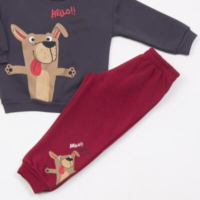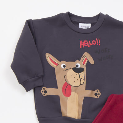 Μπλούζα ανθρακί και παντελόνι κόκκινο ,μακρυμάνικη με ένα σκυλάκι, παντελόνι με λάστιχο στο πάνω και κάτω μέρος.