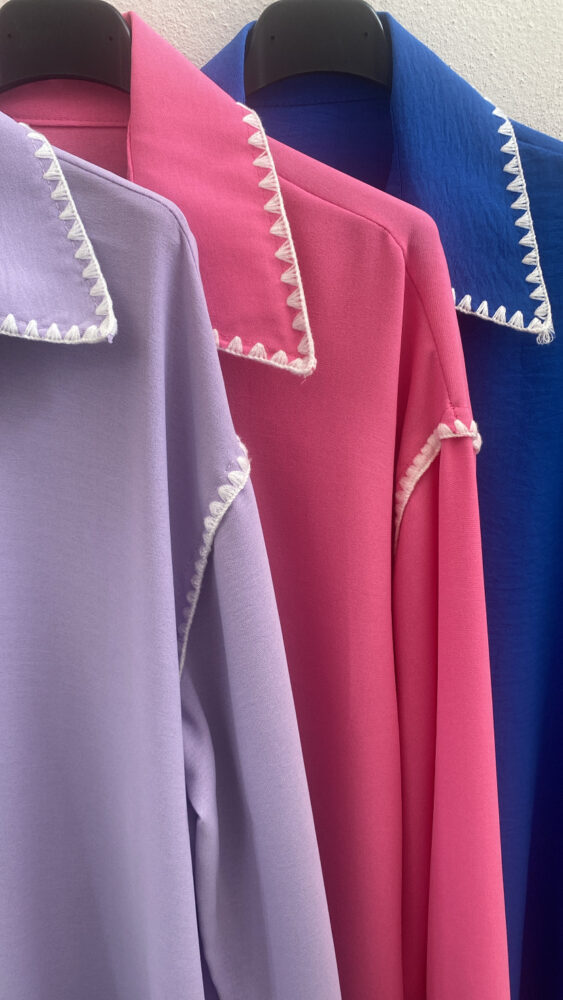 • πουκάμισο μονόχρωμο με κλωστή άσπρη στον γιακά,στα μανίκια και στα κουμπιά.