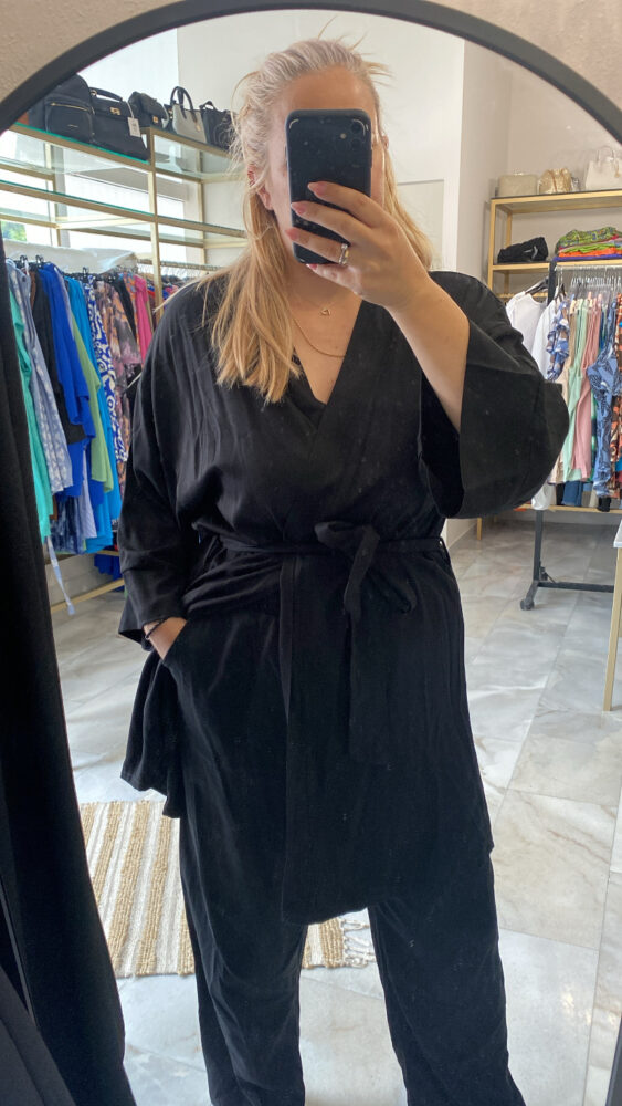 - Σετ κιμονό μακρύ με 3/4 μανίκι και υφασμάτινη ζώνη και παντελόνι με λάστιχο στην μέση σε ίσια γραμμή και τσέπες.