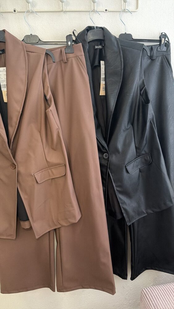 • Σετ δερμάτινο με αμάνικο γιλέκο κουμπί και τσέπες και παντελόνα σε ισια γραμμή με κουμπί φερμουάρ και τσέπες!