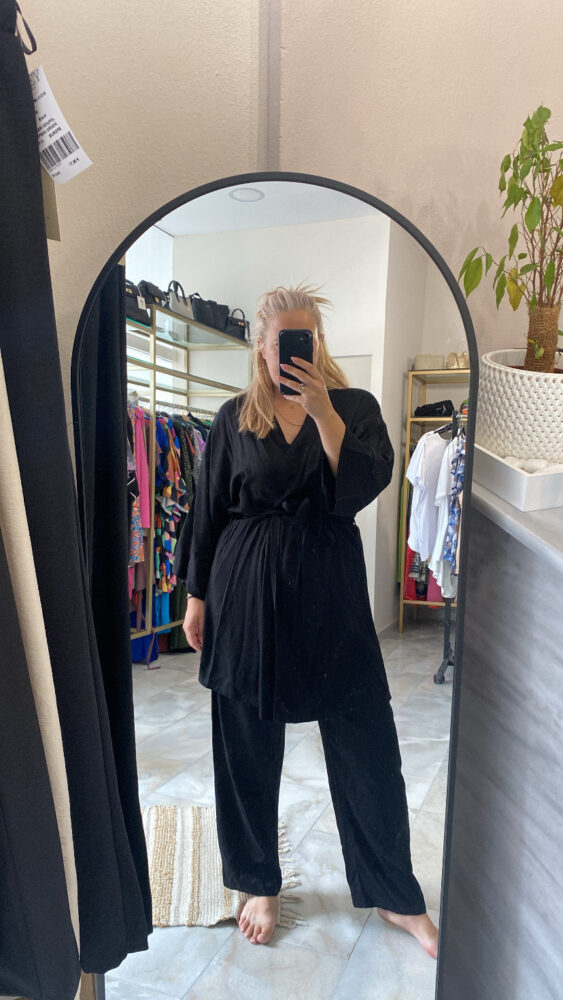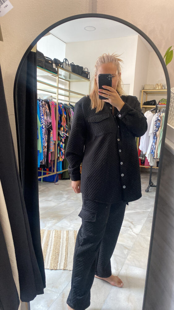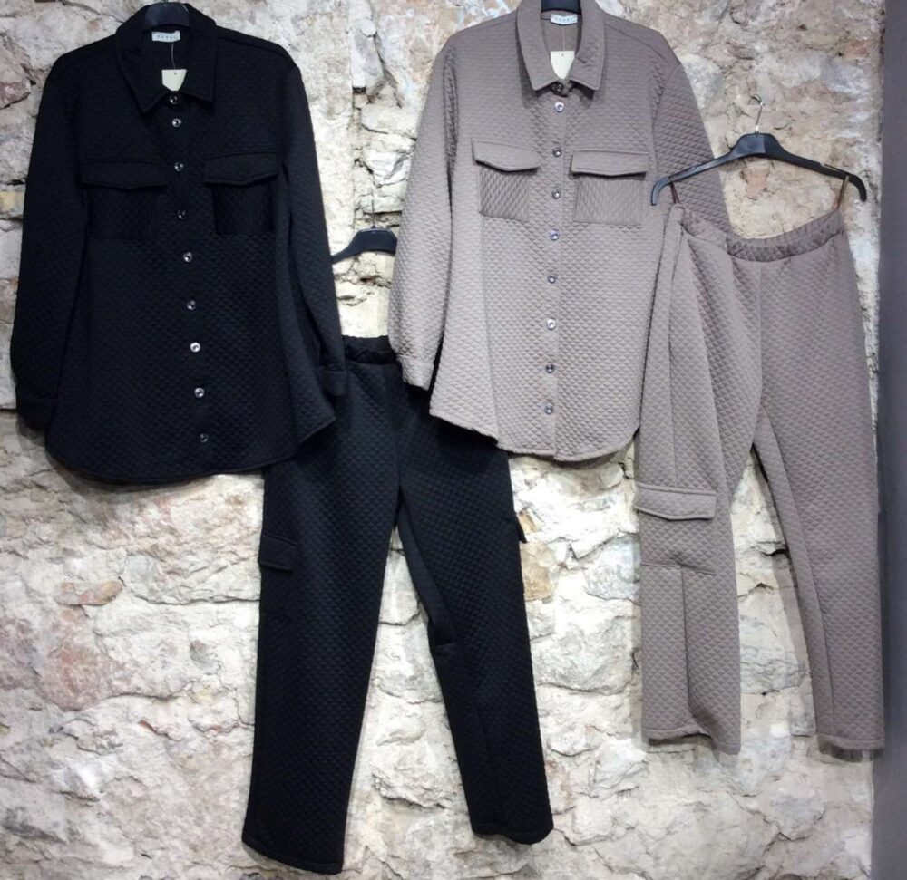 - Σετ φόρμας καπιτονέ με πουκάμισο – jacket , ασημί κουμπιά και τσέπες. Παντελόνι cargo με λάστιχο στην μέση σε ίσια γραμμή και τσέπες.