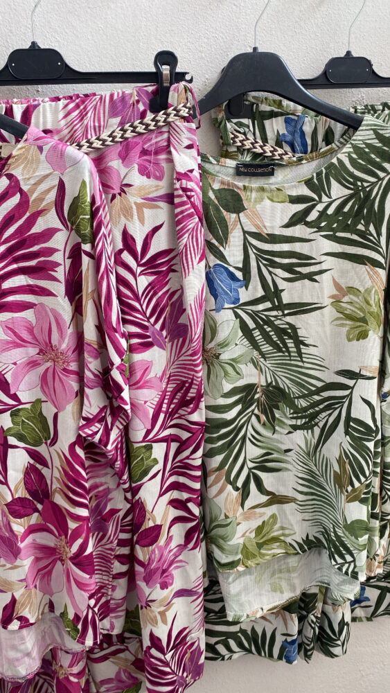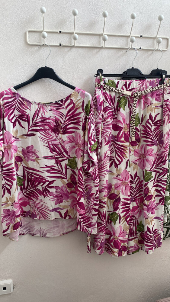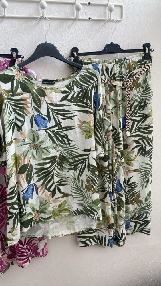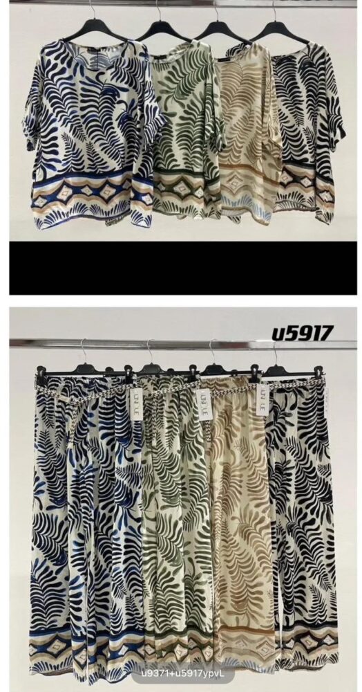 •Σετ εμπριμέ παντελόνα με λάστιχο στην μέση και λεπτό ζωνάκι που σταματάει στον αστράγαλο,μπλούζα κοντομάνικη σε άνετη γραμμή.