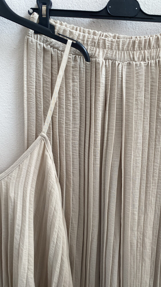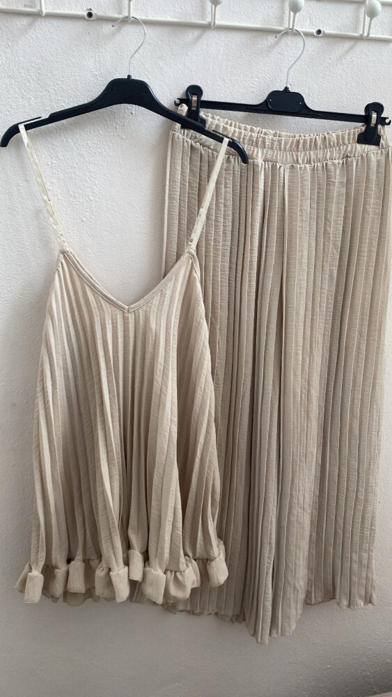 •Σετ πλισέ παντελόνα με λάστιχο στην μέση, μπλούζα με τιράντα που αυξομειώνεται,V μπροστά και πίσω ,βολάν στο τελείωμα της.
