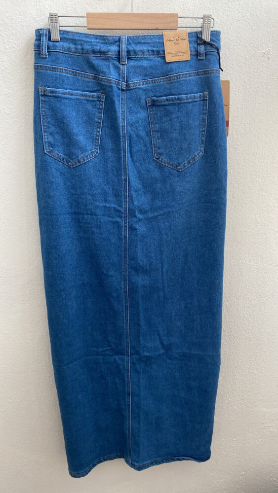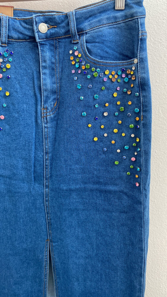 - Τζιν φούστα μακρυά με σκίσιμο μπροστά και χρωματιστά στρας