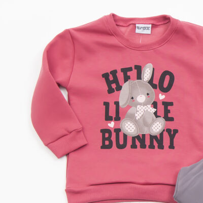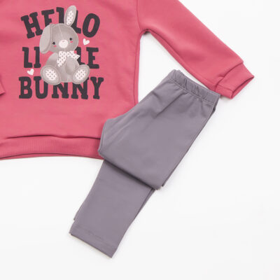 Χρώμα τερακότα με γκρι κολάν ,μακρυμάνικη με γράμματα και ένα λαγουδάκι στην μέση , παντελόνι-κολάν με λάστιχο στο πάνω μέρος.