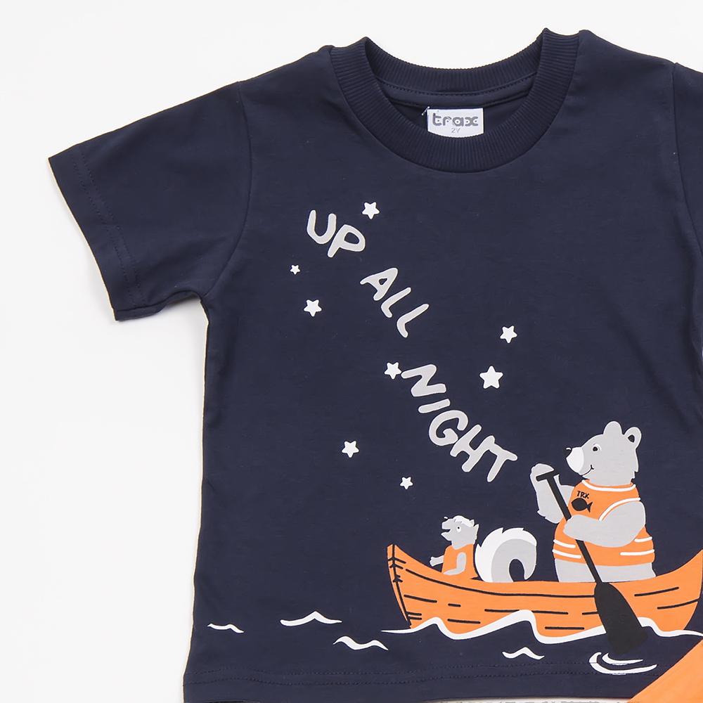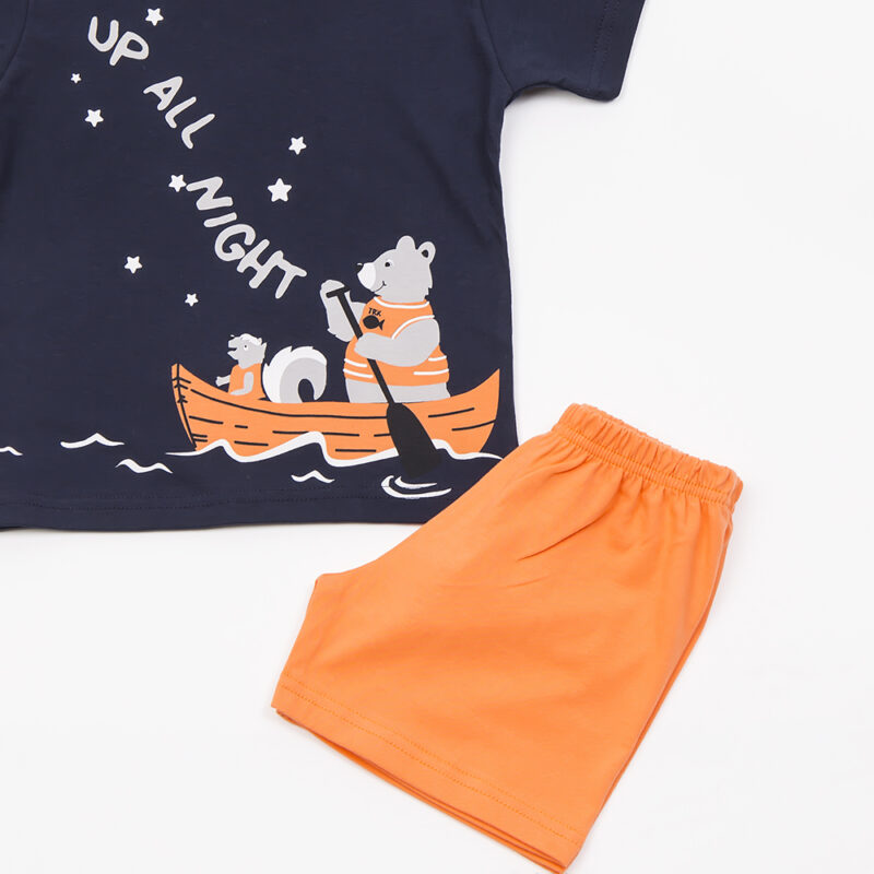 Κοντομάνικη μπλούζα μπλε σκούρο χρώμα με σχέδιο αρκούδο και σκίουρο σε βάρκα. Κοντό παντελονάκι πορτοκαλί με λάστιχο στην μέση .