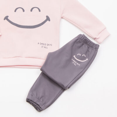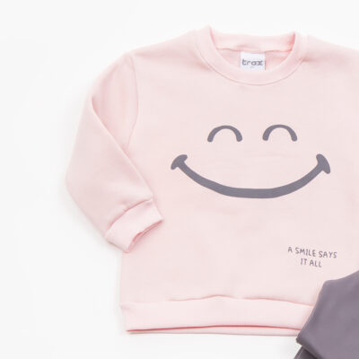 Μπλούζα κουφετί και παντελόνι που μωβίζει ,μακρυμάνικη με ένα χαμόγελο, παντελόνι με λάστιχο στο πάνω και κάτω μέρος.
