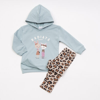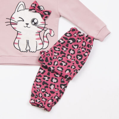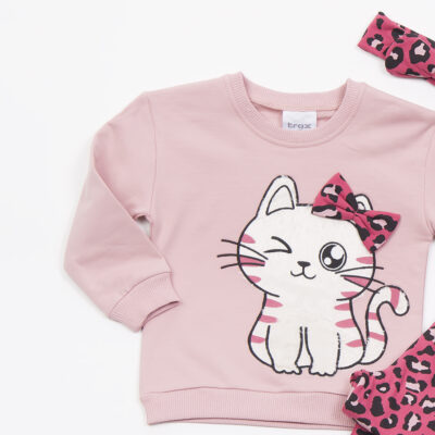 Μπλουζα και παντελόνι με αποχρώσεις του ροζ ,μακρυμάνικη με μια γατόυλα και κορδέλα για τα μαλλιά, παντελόνι-κολάν λεοπάρ με λάστιχο στο πάνω και κάτω μέρος.