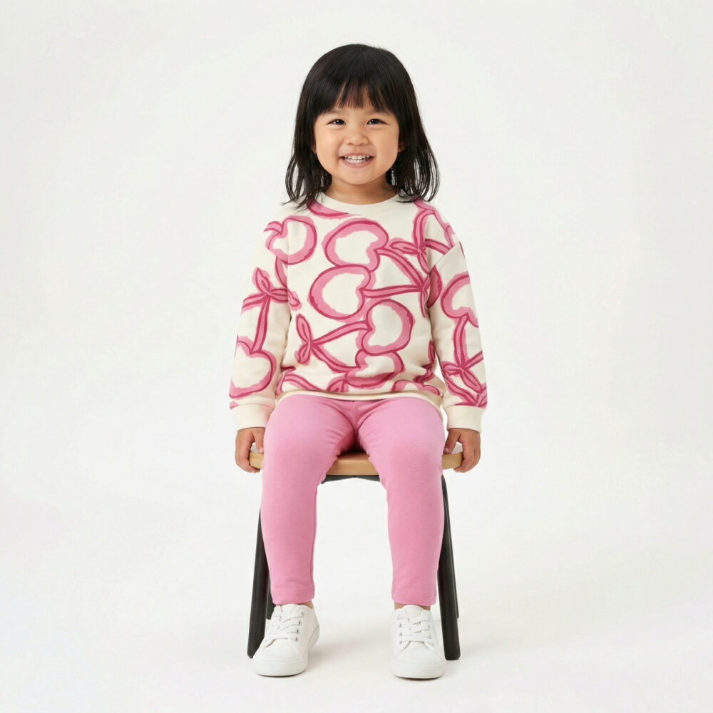 Μπλούζα μακρυμάνικη λευκη με φούξια σχέδια λάστιχο στα μανίκια και στο τελείωμα της και παντελόνι κολάν ροζ με λάστιχο στη μεση!