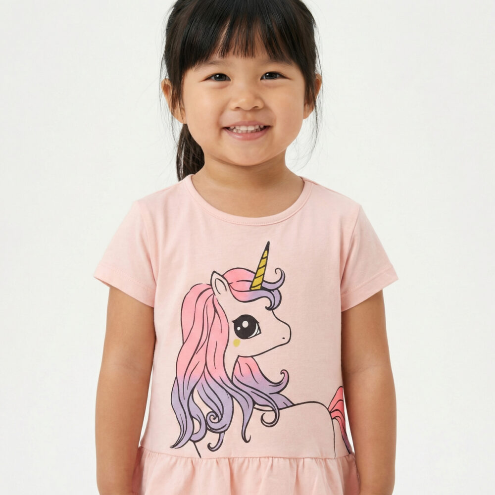 Μπλουζάκι κοντομάνικο ροζ με σχέδιο μονοκερο κ βολάν στο τελείωμα του!Παντελονι μωβ κολάν κάτω απο το γόνατο με σχέδιο αστεράκια στην μια πλευρά κάτω χαμηλα!