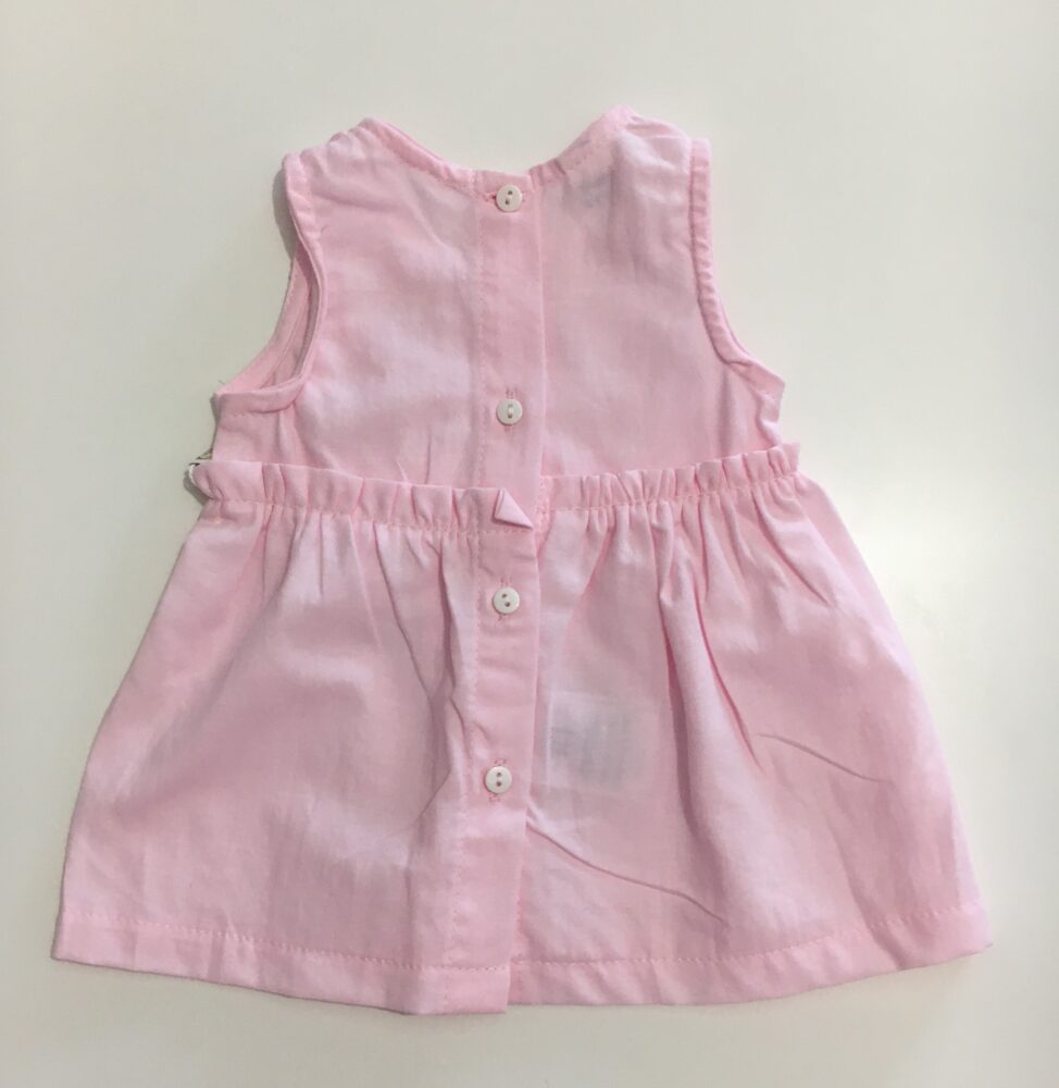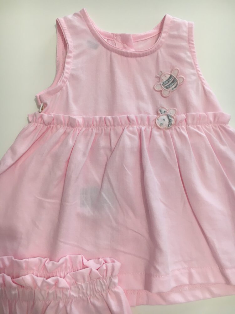 Μπλούζα ροζ, αμάνικη με σχέδιο μελισσούλες στο ύψος του στήθους και κουμπιά στο πίσω μέρος της. Παντελόνι ροζ, κοντό με λάστιχο στο επάνω και κάτω μέρος του.