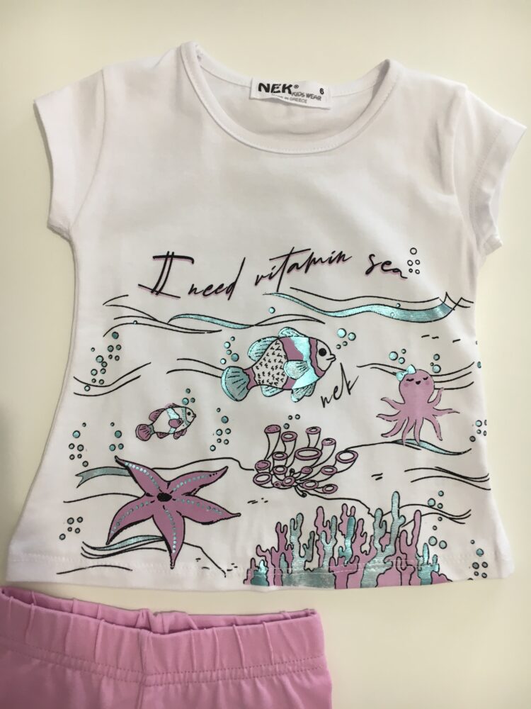Λευκή μπλούζα με κοντό μανίκι και σχέδιο ”Vitamin Sea” στο μπροστινό μέρος της. Λιλά παντελόνι κολάν με λάστιχο στο επάνω μέρος του.