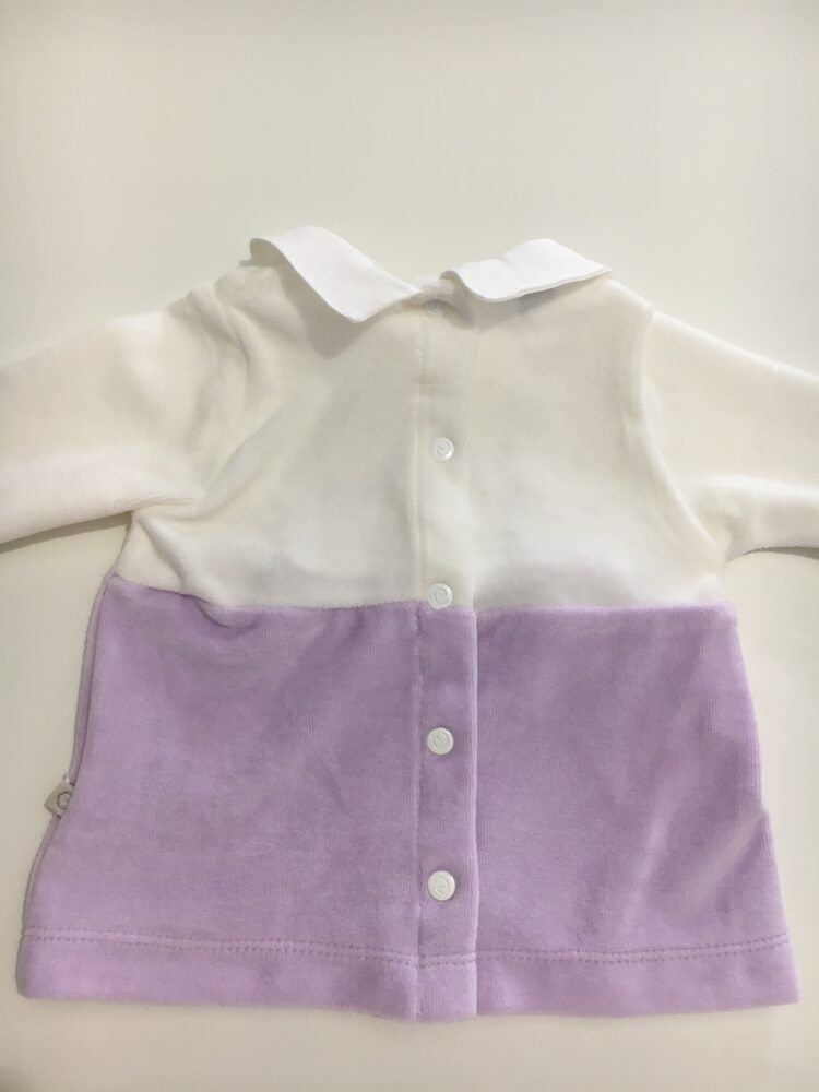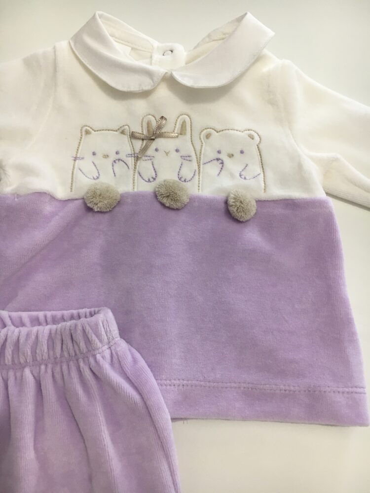 Μπλούζα βελούδινη λευκή-μωβ με μακρύ μανίκι, λευκό γιακά, σχέδιο 3 γάτες και φουντίτσες στο κέντρο της, κουμπιά στο πίσω μέρος της και λάστιχο στα μανίκια της. Παντελόνι βελούδινο μωβ με λάστιχο στο επάνω και κάτω μέρος του.